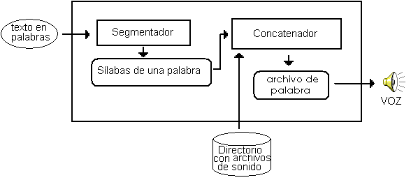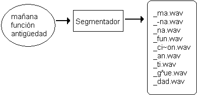 El texto de entrada, llega a un segmentador que se encarga de separar cada una de las palabras de este texto en sílabas (véase la sección 2.5), asignándoles su nombre correspondiente como archivo de sonido. Como ejemplo véase la figura 3.3.