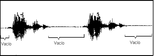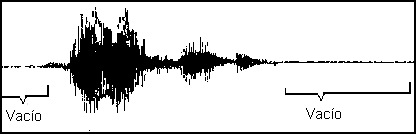 Cuando se graba una sílaba, en la mayoría de los casos, se generan espacios sin voz, debido a que se empieza a hablar después de oprimir el botón de inicio de grabación, así como al terminar de hablar y detener la grabación; a este espacio sin voz, lo llamaremos vacío, por no contener información de sonido importante. Una vez que han sido grabadas estas sílabas, es necesario eliminar el vacío que se tiene al inicio y fin de la sílaba, como se observa en la figura 3.4.